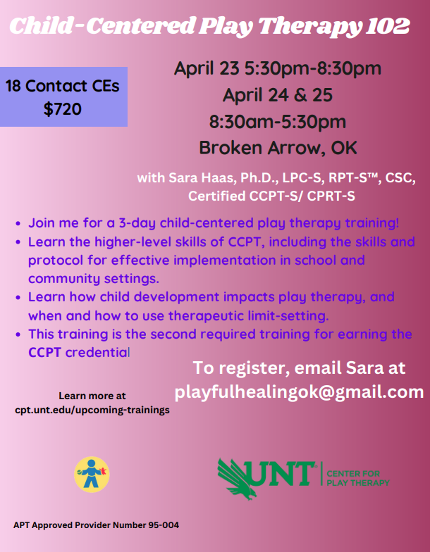 This is a 3-day advanced in-person training in the practice and application of Child-Centered Play Therapy. This intensive training on the application of CCPT will be an exciting time together to learn about the practice and application of CCPT. Content will include: understanding development, the process of CCPT (relational disruptions and enacting conditions), themes in CCPT, advanced limit setting, specific presenting problems/populations, parent consultation, advocacy/general research findings, and opportunities to practice, practice, practice!