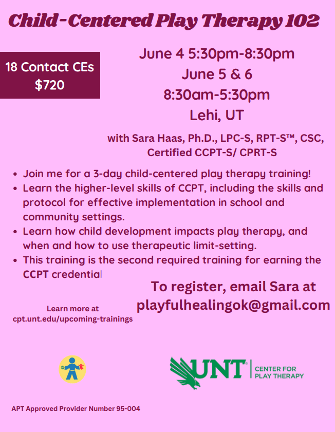 This is a 3-day advanced in-person training in the practice and application of Child-Centered Play Therapy. This intensive training on the application of CCPT will be an exciting time together to learn about the practice and application of CCPT. Content will include: understanding development, the process of CCPT (relational disruptions and enacting conditions), themes in CCPT, advanced limit setting, specific presenting problems/populations, parent consultation, advocacy/general research findings, and opportunities to practice, practice, practice!