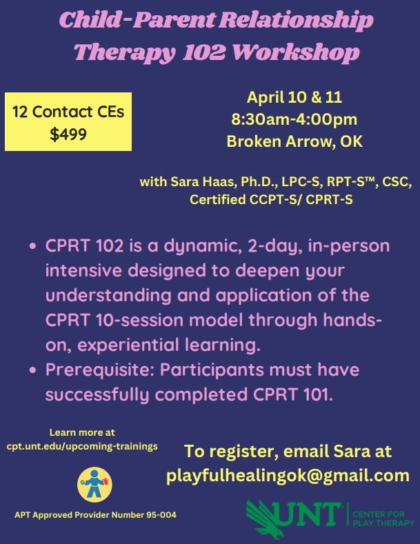 This 2-day in-person intensive training on the application of Child-Parent Relationship Therapy (CPRT) will be a dynamic and hands-on time together to learn the practice and application of the CPRT 10-session model. Content will include detailed session by session use of the CPRT protocol, intensive applied practice and roleplay, supplemental resources, and clinical considerations for working with specific populations (12 CE hours)
