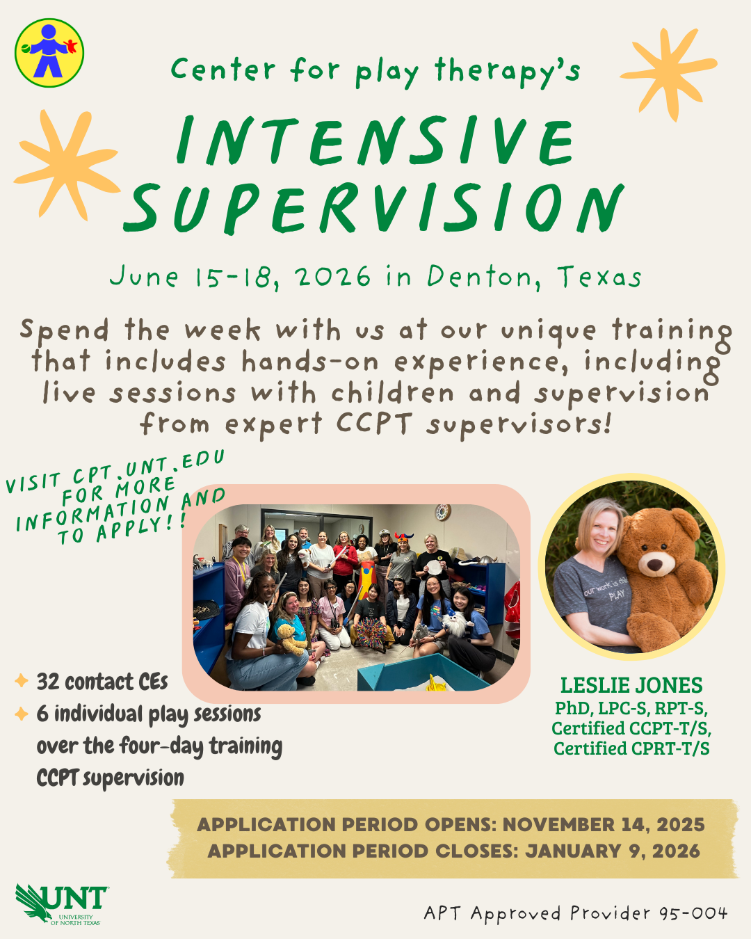 If you have any questions, please call the Center for Play Therapy at 940-565-3864 or email Nekiya Jackson at nekiyajackson@my.unt.edu.